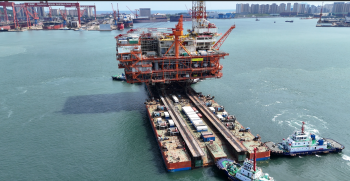 我國渤海最大海上油氣平臺—— 墾利10-2油田群開發項目(一期) 中心處理平臺在山東青島離港起運